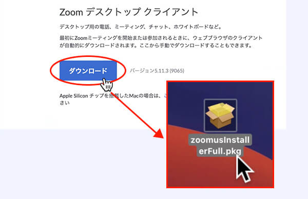 ダウンロードページの「Zoom デスクトップ クライアント」にある「ダウンロード」をクリックしPCの任意の場所にインストーラーを保存します。