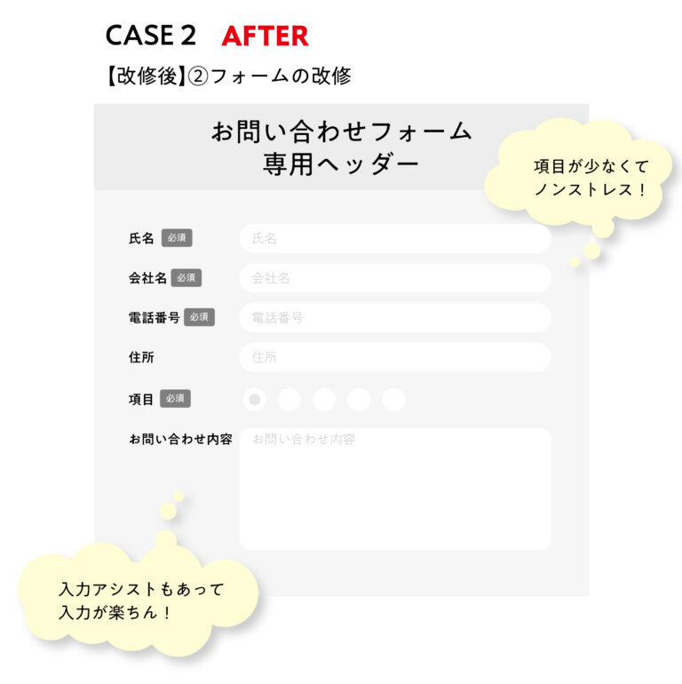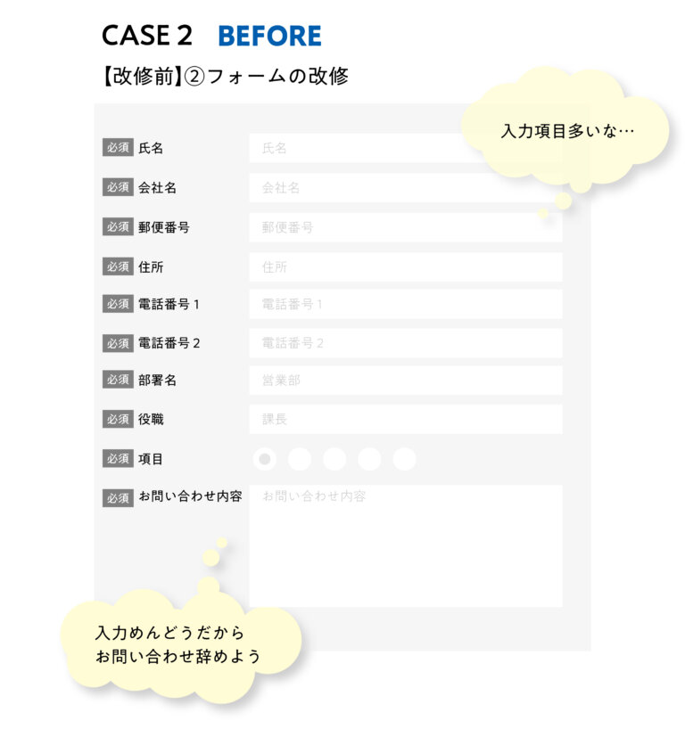 今回の事例のように、ユーザーがお問い合わせページには訪れているものの、その後のコンバージョン(CV)につながっていないというケースは多々あります。この事例では、入力項目の多さや、入力をリアルタイムに支援する機能の欠如がユーザーの離脱を招いていると判断し、入力項目のスリム化や入力補助(=入力済みマーク、未入力項目の色付けなど)を導入。結果として、お問い合わせの完了率が約70%も改善しました。