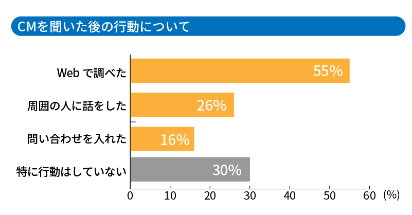 また同調査によると、ラジオ広告は視聴後の行動割合を示す以下のデータどおり、行動喚起につながることもわかっています。