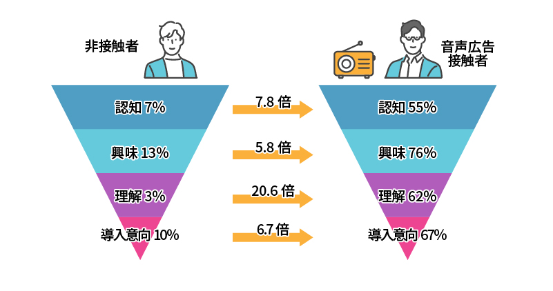 ラジオ広告を含む音声媒体は、集客だけではなく興味・関心、理解まで両立できます。また、視覚を用いたメディアよりも注意力を引き付ける効果があり、コスト効率も高いとされています。